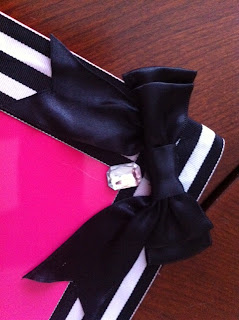 Then, I glued the satin bows in each corner, and applied the random little plastic gems in the corners.